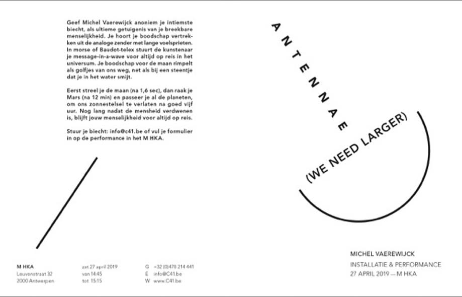 With analogue EM generators and (large) antennas I stimulate the Electromagnetic field, creating soft waves that carry Morse code or Baudot telex messages into the universe. Therefore I collect very intimate testimonies or confessions as proof of our fragile humanity and cast them into the universe with the speed of light.